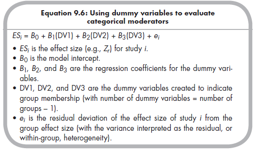 In primary data analysis, it has long been recognized that ANOVA is simply a special case of multiple regression (e.g., Cohen, 1968). The same com parability applies to meta-analytic evaluation of categorical moderators. As with translation of ANOVA into multiple regression in primary analysis, the “trick” is to create a series of dichotomous variables that fully capture the different groups. The most common approach is through the use of dummy variables.
