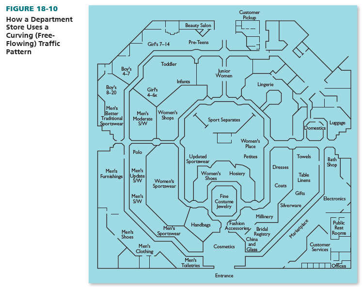 A curving traffic pattern is used by department stores, apparel stores, and other shopping- oriented stores. This approach has several benefits: