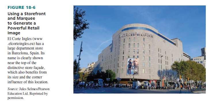 A marquee is a sign that displays the store’s name. It can be painted or a neon light, printed or script, and set alone or mixed with a slogan (trademark) and other information. The marquee should attract attention, as El Corte Ingles’ distinctive logo on the front of each of its department stores does. See Figure 18-6. Image is influenced because a marquee can be gaudy and flashy or subdued and subtle. The world’s best-known marquee is McDonald’s golden arches.