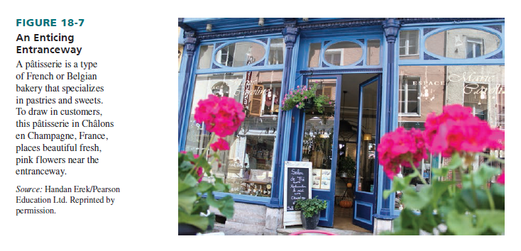 Second, the type of entrance(s) is chosen. The doorway can be revolving; electric, self-opening; regular, push-pull; or climate-controlled. The latter is an open entrance with a curtain of warm or cold air, set at the same temperature as inside the store. Entrance flooring can be cement, tile, or carpeting. Lighting can be traditional or fluorescent, white or colors, and/or flashing or constant. At the bakery depicted in Figure 18-7, the exterior entrance and displays are inviting and designed to reinforce its image for freshness.