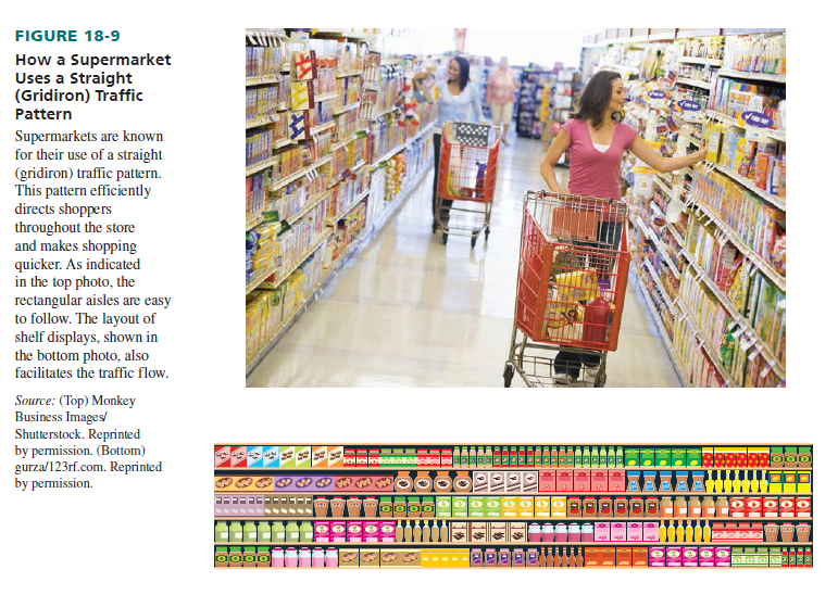 DETERMINATION OF A TRAFFIC-FLOW PATTERN The traffic-flow pattern of the store is then set. A straight (gridiron) traffic flow places displays and aisles in a rectangular or gridiron pattern, as shown in Figure 18-9. A curving (free-flowing) traffic flow places displays and aisles in a free- flowing pattern, as shown in Figure 18-10.