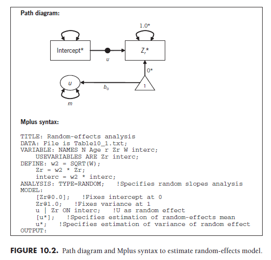 The Mplus syntax shown in Figure 10.2 specifies that this is a random- slopes analysis by inserting the “TYPE=RANDOM” command, specifying that U represents the random effect with estimated mean and variance. The mean of U is the random-effects mean of this meta-analysis; here, the value was estimated to be 0.369 with a standard error of .049. This indicates that the random-effects mean Zr is .369 (equivalent r = .353) and statistically significant (Z = .369/.049 = 7.53, p < .01; alternatively, I could compute confidence intervals). The between-study variance (t2) is estimated as the variance of U; here, the value is .047.