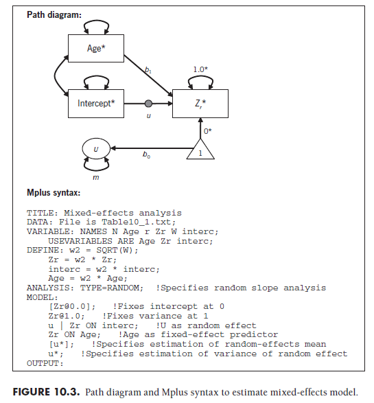 In Chapter 9, I introduced an alternative approach to meta-analysis based on Cheung’s (2008) description of meta-analysis within the context of structural equation modeling. Here, I extend the logic of this approach to describe how it can be used to estimate random- and mixed-effects models (following closely the presentation by Cheung, 2008). As when I introduced this approach in Chapter 9, I should caution you that this material requires a fairly in-depth understanding of SEM, and you might consider skipping this section if you do not have this background. If you do have a solid background in SEM, however, this perspective may be advantageous in two ways. First, if you are familiar with SEM programs that can estimate random slopes (e.g., Mplus, MX; I elaborate on this requirement below), then you might find it easier to use this approach than the matrix algebra required for the mixed- effects model that I described earlier. Second, as I mentioned in Chapter 9, this approach uses the FIML method of missing data management of SEM, which allows you to retain studies that have missing values of study characteristics that you wish to evaluate as moderators.