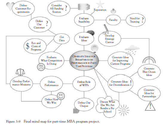 The process begins by writing the project goal in the center of the page. As is illustrated in Figure 3-6, the part-time MBA project team defined the goal for the project as generating ideas for breakthrough performance in the part-time MBA program. In particular, notice the inspirational language used in defining the project goal which helps further motivate team members and stimulate their creativity.