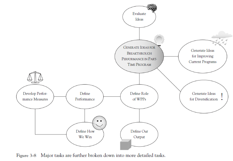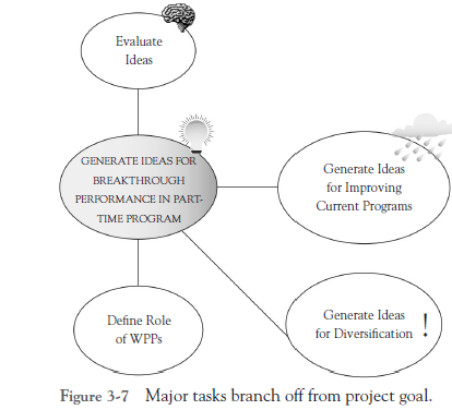 Once the project goal is defined, team members can brainstorm to identify the major tasks that must be done to accomplish this goal. In developing the mind map for the project, the MBA team initially identified four major tasks: (1) define the role of working professional programs (WPPs), (2) generate ideas for improving current programs, (3) generate ideas for diversification, and (4) evaluate the ideas generated. As illustrated in Figure 3-7, these major tasks branch off from the project goal.