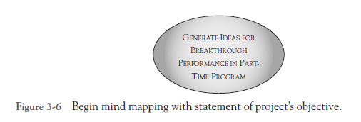 The process begins by writing the project goal in the center of the page. As is illustrated in Figure 3-6, the part-time MBA project team defined the goal for the project as generating ideas for breakthrough performance in the part-time MBA program. In particular, notice the inspirational language used in defining the project goal which helps further motivate team members and stimulate their creativity.