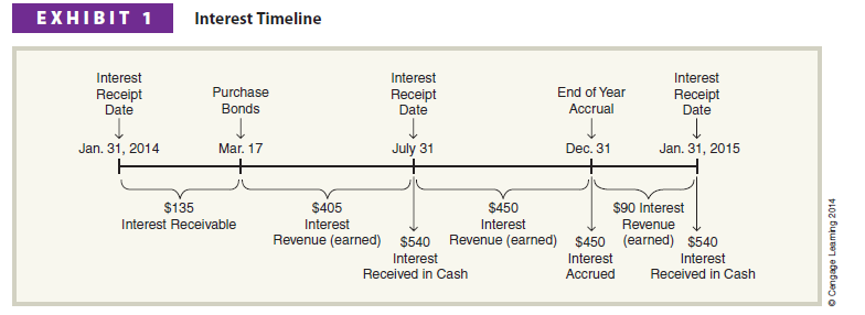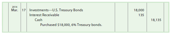 To illustrate, assume that Homer Company purchases $18,000 of U.S. Treasury bonds at their face amount on March 17, 2014, plus accrued interest for 45 days. The bonds have an interest rate of 6%, payable on July 31 and January 31.