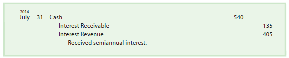 On July 31, Homer Company receives a semiannual interest payment of $540 ($18,000 x 6% X %). The $540 interest includes the $135 accrued interest that Homer Company purchased with the bonds on March 17. Thus, Homer Company has earned $405 ($540 – $135) of interest revenue since purchasing the bonds, as shown in Exhibit 1. The receipt of the interest on July 31 is recorded as follows: