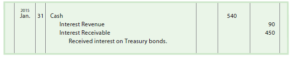 The receipt of the semiannual interest of $540 on January 31, 2015, is recorded as follows: