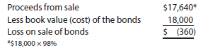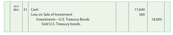 To illustrate, on January 31, 2015, Homer Company sells the Treasury bonds at 98, which is a price equal to 98% of their face amount. The sale results in a loss of $360, as shown below.