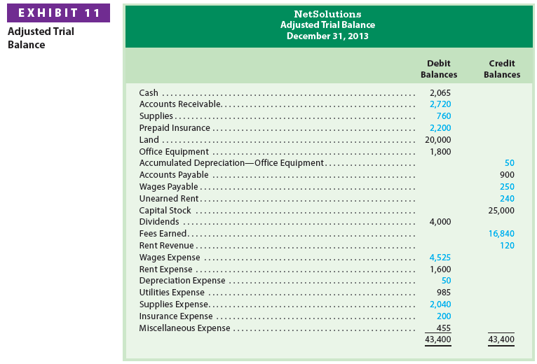 Exhibit 11 shows the adjusted trial balance for NetSolutions as of December 31, 2013. Chapter 4 discusses how financial statements, including a classified balance sheet, are prepared from an adjusted trial balance.