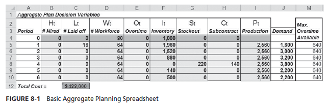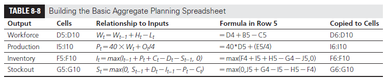 The aggregate planner must decide on the number of people hired (Ht) or laid off (Lt) each month, along with any overtime (Ot) or subcontracting (Ct). Once these decisions have been made, one can determine the workforce (Wt), production (Pt), inventory (It) and stockout (St) for each month (see Table 8-8), thus completing the aggregate plan. Figure 8-1 shows the final spreadsheet (available as Chapter8-trial-aggplan) corresponding to Table 8-4. The planner can try different inputs for each decision variable in the appropriate cells in worksheet Planning. It is best to start with the number hired (B5:B10) and number laid off (C5:C10) in each period. The maximum overtime available in a given month is limited by 10 X Wt and is shown in cells M5:M10. One can then enter the overtime (E5:E10) and amount subcontracted (H5:H10) for each period. For each set of inputs, the outputs are calculated as shown in Table 8-8.