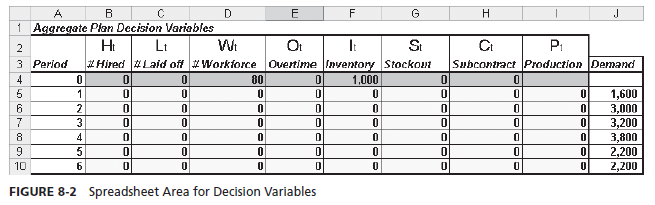 Figure 8-2 (use worksheet Planning) illustrates what this table should look like. The decision variables are contained in cells B5:I10, with each cell corresponding to a decision variable. For example, cell D7 corresponds to the workforce size in Period 3. Begin by setting all the decision variables to 0, as shown in Figure 8-2.