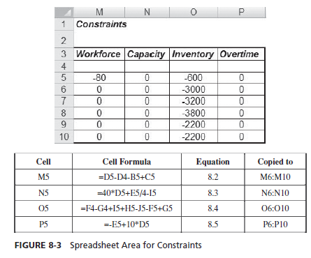 Column M contains workforce constraints (Equation 8.2), column N contains capacity constraints (Equation 8.3), column O contains inventory balance constraints (Equation 8.4), and column P contains overtime constraints (Equation 8.5). These constraints are applied to each of the six periods.