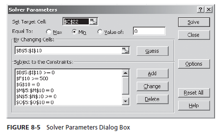The Solver Parameters dialog box is shown in Figure 8-5. Click on Solve. The optimal solution should be returned. If Solver does not return the optimal solution, solve the problem again after saving the solution that Solver has returned. (In some cases, multiple repetitions of this step may be required because of some flaws in the version of Solver that comes with Excel. Add-ins that do not have any of these issues are available at relatively low cost.) The optimal solution turns out to be the one shown in Table 8-4.
