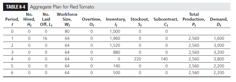 Red Tomato lays off a total of 16 employees at the beginning of January. After that, the company maintains the workforce and production level. It uses the subcontractor during the month of April. Red Tomato carries a backlog only from April to May; in all other months, it plans no stockouts. In fact, it carries inventory in all other periods. We describe this inventory as seasonal inventory because it is carried in anticipation of a future increase in demand.