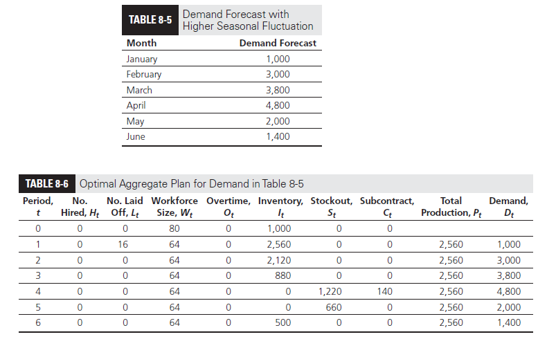 All the data are exactly the same as in our previous discussion of Red Tomato, except for the demand forecast. Assume that the same overall demand (16,000 units) is distributed over the six months in such a way that the seasonal fluctuation of demand is higher, as shown in Table 8-5. Obtain the optimal aggregate plan in this case.