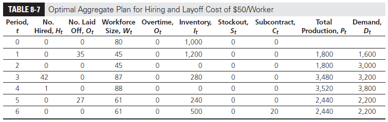 If the costs of hiring and layoff decrease to $50 each, the cost corresponding to the aggregate plan in Table 8-4 decreases from $422,660 to $412,770. Taking this new cost into account and determining a new optimal aggregate plan yields the plan shown in Table 8-7. Observe that the workforce size fluctuates between a high of 88 and a low of 45, as opposed to being stable at 64 as in Table 8-4.