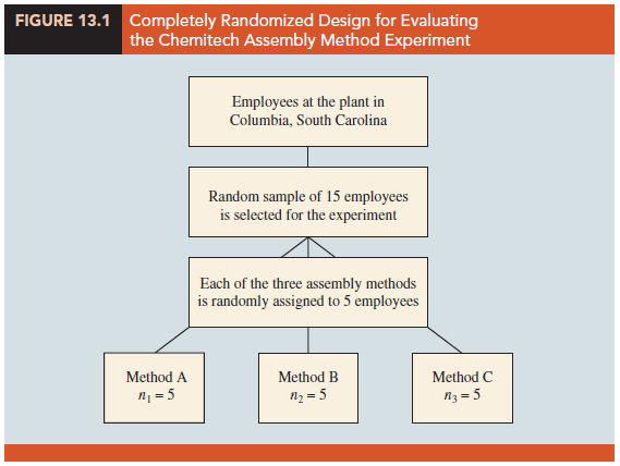 Note that this experiment would result in only one measurement or number of units assembled for each treatment. To obtain additional data for each assembly method, we must repeat or replicate the basic experimental process. Suppose, for example, that instead of selecting just three workers at random we selected 15 workers and then randomly assigned each of the three treatments to 5 of the workers. Because each method of assembly is assigned to 5 workers, we say that five replicates have been obtained. The process of replication is another important principle of experimental design. Figure 13.1 shows the completely randomized design for the Chemitech experiment.