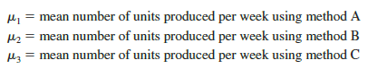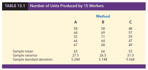 Once we are satisfied with the experimental design, we proceed by collecting and analyzing the data. In the Chemitech case, the employees would be instructed in how to perform the assembly method assigned to them and then would begin assembling the new filtration systems using that method. After this assignment and training, the number of units assembled by each employee during one week is as shown in Table 13.1. The sample means, sample variances, and sample standard deviations for each assembly method are also provided. Thus, the sample mean number of units produced using method A is 62; the sample mean using method B is 66; and the sample mean using method C is 52. From these data, method B appears to result in higher production rates than either of the other methods.