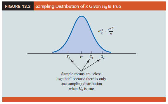 If the null hypothesis, H0: m1 = m2 = m3, is true, we can use the variability among the sample means to develop an estimate of s2. First, note that if the assumptions for analysis of variance are satisfied and the null hypothesis is true, each sample will have come from the same normal distribution with mean m and variance s2. Recall from Chapter 7 that the sampling distribution of the sample mean x for a simple random sample of size n from a normal population will be normally distributed with mean m and variance s2/n. Figure 13.2 illustrates such a sampling distribution.