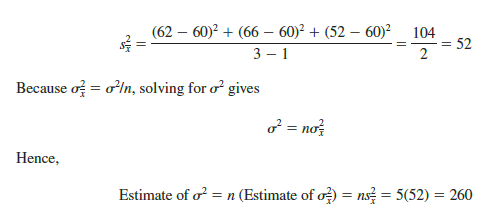 X1 = 62, X2 = 66, and X3 = 52 from Table 13.1, as values drawn at random from the sampling distribution shown in Figure 13.2. In this case, the mean and variance of the three X values can be used to estimate the mean and variance of the sampling distribution. When the sample sizes are equal, as in the Chemitech experiment, the best estimate of the mean of the sampling distribution of X is the mean or average of the sample means. In the Chemitech experiment, an estimate of the mean of the sampling distribution of X is (62 + 66 + 52)/3 = 60. We refer to this estimate as the overall sample mean. An estimate of the variance of the sampling distribution of X, σ 2x, is provided by the variance of the three sample means.