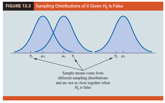 The between-treatments estimate of σ2 is based on the assumption that the null hypothesis is true. In this case, each sample comes from the same population, and there is only one sampling distribution of X. To illustrate what happens when H0 is false, suppose the population means all differ. Note that because the three samples are from normal populations with different means, they will result in three different sampling distributions. Figure 13.3 shows that in this case, the sample means are not as close together as they were when H0 was true. Thus, s2x will be larger, causing the between-treatments estimate of σ2 to be larger. In general, when the population means are not equal, the between-treatments estimate will overestimate the population variance σ2.