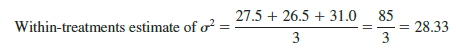 The variation within each of the samples also has an effect on the conclusion we reach in analysis of variance. When a simple random sample is selected from each population, each of the sample variances provides an unbiased estimate of a2. Hence, we can combine or pool the individual estimates of a2 into one overall estimate. The estimate of a2 obtained in this way is called the pooled or within-treatments estimate of a2. Because each sample variance provides an estimate of a2 based only on the variation within each sample, the within-treatments estimate of a2 is not affected by whether the population means are equal. When the sample sizes are equal, the within-treatments estimate of a2 can be obtained by computing the average of the individual sample variances. For the Chemitech experiment we obtain