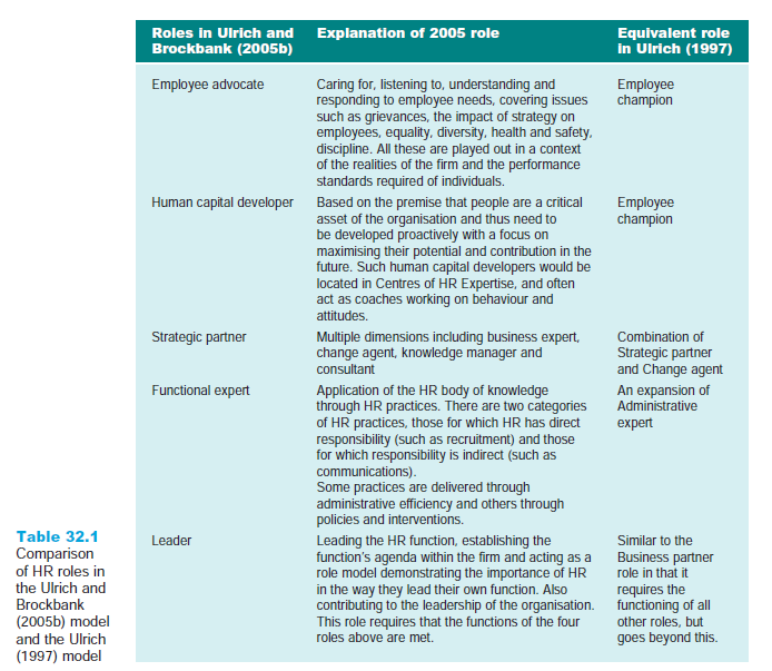 On the basis of further research Ulrich and Brockbank (2005a, 2005b) provided a view of the way in which HR roles had evolved since 1997, and this new analysis focuses on what an HR professional has to do to create value. In the new synthesis of roles, most of the roles have new titles. These are: Employee advocate; Human capital developer; Strategic partner; Functional expert; and the compound role of Leader. However, the roles reported in 2005 can be linked back to the earlier model, as shown in Table 32.1.