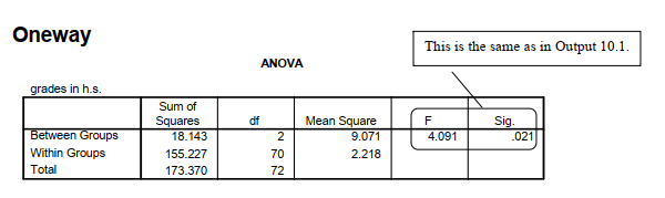 The first table in both Outputs 10.2a and 10.2b repeats appropriate parts of the ANOVA table from Output 10.1. The second table in Output 10.2a shows the Tukey HSD test for grades in h.s. that you would use if the three group sizes (n = 38, 16, 19 from the first table in Output 10.1) had been similar. For grades in h.s., this Tukey table indicates that there is only a small mean difference (.22) between the mean grades of students whose fathers were high school grads or less (M = 5.34 from Output 10.1) and those fathers who had some college (M = 5.56). The Homogeneous Subsets table shows an adjusted Tukey that is appropriate when group sizes are not similar, as in this case. Note that there is not a statistically significant difference (p = .880) between the grades of students whose fathers were high school grads or less (low education) and those with some college (medium education) because their means are both shown in Subset 1. In Subset 2, the medium and high education group means are shown, indicating that they are not significantly different (p = .096). By examining the two subset boxes, we can see that the low education group (M = 5.34) is different from the high education group (M = 6.53) because these two means do not appear in the same subset. Output 10.2b shows, for math achievement, the Games-Howell test, which we use for variables that have unequal variances. Note that each comparison is presented twice. The Mean Difference between students whose fathers were high school grads or less and those with fathers who had some college was -4.31. The Sig. (p = .017) indicates that this is a significant difference. We can also tell that this difference is significant because the confidence interval’s lower and upper bounds both have the same sign, which in this case was a minus, so zero (no difference) is not included in the confidence interval. Similarly, students whose fathers had a B.S. degree were significantly different on math achievement from those whose fathers had a high school degree or less (p = .008).