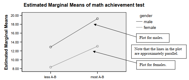 Next we examine the main effects of math grades and of gender. Note that both are statistically significant. The significant F for math grades means that students with fewer As and Bs in math scored lower (M = 10.81 vs. 15.05) on math achievement than those with high math grades, and this difference is statistically significant (p < .001). Gender is also significant (p < .001). Because the interaction is not significant, the “effect” of math grades on math achievement is about the same for both genders. If the interaction were significant, we would say that the “effect” of math grades depended on which gender you were considering. For example, it might be large for boys and small for girls. If the interaction is significant, you should also analyze the differences between cell means (the simple effects). Leech et al. (in press) shows how to do this and discusses more about how to interpret significant interactions. The profile plots may be helpful in visualizing the interaction, but you should not discuss statistically nonsignificant differences because the plots may be misleading.