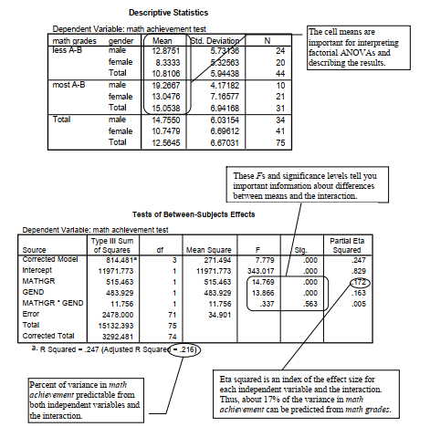 Note also the callout boxes about the adjusted R squared and eta squared. Eta, the correlation ratio, is used when the independent variable is nominal and the dependent variable (math achievement in this problem) is normal. Eta2 is an indicator of the proportion of variance that is due to between-groups differences. Adjusted R2 refers to the multiple correlation coefficient squared. Like r2, these statistics indicate how much variance or variability in the dependent variable can be predicted if you know the independent variable scores. In this problem, the eta2 percentages for these key Fs vary from 0.5% to 17.2%. Because eta and R, like r, are indexes of association, they can be used to interpret the effect size. However, Cohen’s guidelines for small, medium, and large are somewhat different (for eta, small = .10, medium = .24, and large = .37; for R, small = .14, medium = .36, and large = .51).
