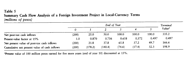 Table 5 presents the summary cash flow analysis of a foreign investment project in local-currency terms, that is to say, from the perspective of the project rather than from the perspective of the parent company. The investor’s time horizon is ten years, but estimated cash flows are shown for only five years, with a terminal value indicating the project’s market value at the end of the fifth year.