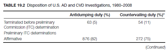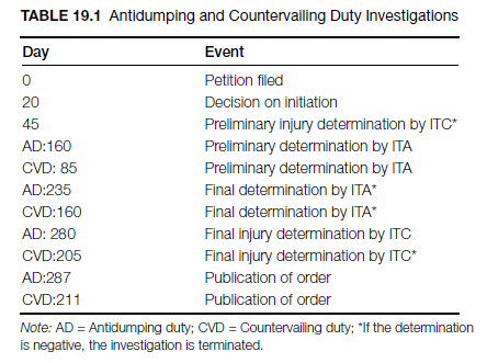 Antidumping (AD) and countervailing duty (CVD) investigations are conducted either on the basis of a petition filed with the Department of Commerce (Commerce) through the International Trade Administration (ITA) and the International Trade Commission on behalf of a domestic industry or by Commerce upon its own initiative. In the latter case, Commerce must notify the ITC. In a countervailing duty investigation, the ITC plays an active role only when the foreign government conferring the subsidies has entered a trade agreement such as the Subsidies Code or a similar arrangement with the United States (USITC, 2008). The procedural steps of a typical investigation are described in Table 19.1.