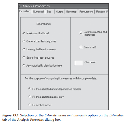 ML estimation of the hypothesized model incurs only one basic difference when data are incomplete than when they are complete. That is, in specifying the model for analyses based on incomplete data, it is necessary to activate the Analysis Properties dialog box and then check off Estimate means and intercepts on the Estimation tab. Although this dialog box was illustrated in Chapter 8 with respect to structured means models, it is reproduced again here in Figure 13.1.