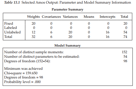 Presented in Table 13.1, you will see both the parameter summary and model summary information pertinent to our current incomplete data sample. In the interest of pinpointing any differences between the incomplete and complete (see Table 3.3 and Figure 3.7) data samples, let’s now compare this information with respect to these same sections of the output file. First, notice that, although the number of fixed parameters in the model is the same (20) for the two samples, the number of unlabeled parameters (i.e., estimated parameters) varies, with the incomplete data group having 54, and the complete data sample having 38. The explanation of this discrepancy lies with the estimation of 16 intercepts for the incomplete data sample (but not for the complete data sample). Second, observe that although the number of degrees of freedom (98) remains the same across complete and incomplete data samples, its calculation is based upon a different number of sample moments (152 versus 136), as well as a different number of estimated parameters (54 versus 38). Finally, note that, despite the loss of 25% of the data for the one sample, the overall x2 value remains relatively close to that for the complete data sample (159.650 versus 158.511).