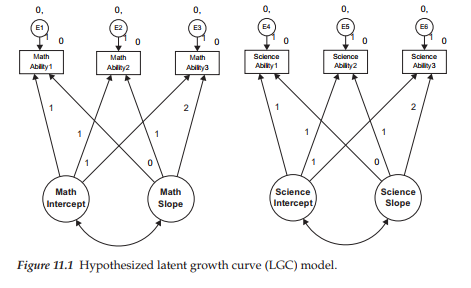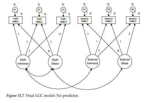 Let’s turn now to the modeled paths in the diagram. As usual, the arrows leading from each of the four factors to their related observed variables represent the regression of observed scores at each of three time points onto their appropriate Intercept and Slope factors. As usual, the arrows leading from the Es to the observed variables represent the influence of random measurement error. Finally, the modeled covariance between each pair of Intercept and Slope factors (for math and science ability) is assumed in the specification of a LGC model.
