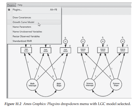 Following this long but nonetheless essential overview of the modeling and testing of LGC models using Amos Graphics, we are now ready to test the model shown in Figure 11.1 and examine the results.