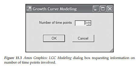 In building a LGC model using Amos Graphics, the program provides what it terms a Plug-in, an option that serves as a starter kit in providing the basic model and associated parameter specification. To use this Plug-in, click on the Plug-in menu and select Growth Curve Model, as shown in Figure 11.2. Once you make this selection and click on this growth curve option, the program asks if you wish to save the existing model. Once you say yes, the model disappears and you are presented with a blank page accompanied by a dialog box concerning the number of time points to be used in the analysis. Shown in Figure 11.3, however, is the number 3, which is the default value as it represents the minimal appropriate number for LGC modeling.