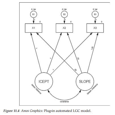 A second change between the model shown in Figure 11.1 and that of Figure 11.4 involves labels associated with the latent factors. On the automated model, you will note the labels, IMean, Variance, SMean, and SVariance associated with the Intercept and Slope factors, respectively.