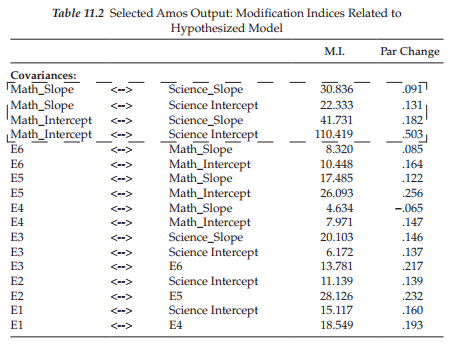 Of prime importance in testing this first model are the extent to which it fits the data and the extent to which it may need some modification. We turn first to the goodness-of-fit statistics reported in Table 11.1. Of key concern here is the obviously poor fit of the model as indicated by the CFI value of .811 and the RMSEA value of .172. Clearly this model is misspeci- fied in a very major way. For answers to this substantial misspecification, let’s review the modification indices, which are reported in Table 11.2. Of primary interest are misspecification statistics associated with the two intercept and two slope factors, which have been highlighted within the broken-line rectangle.