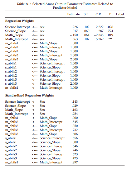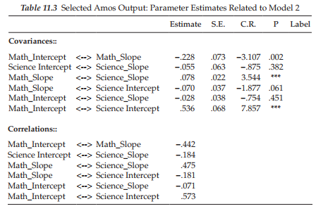 In reviewing these modification indices, we see that not including a covariance between the Math Ability and Science Ability Intercept factors is accounting for the bulk of the misspecification. Given the fairly substantial modification indices associated with the remaining three factor covariances, together with Willet and Sayer’s (1996) caveat that, in multiple-domain LGC models, covariation among the growth parameters across domains should be considered, I respecified a second model (Model 2) in which all four factor covariances were specified. These results, as they relate to the parameter estimates, are reported in Table 11.3.