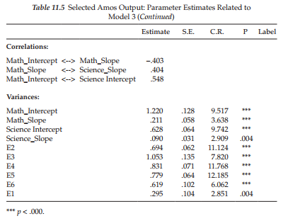 Turning to the first between-domain covariance shown in the output (Math Slope/Science Slope), we see that, although statistically significant, this reported value is small (.056). Nonetheless, a review of the standardized coefficients show this correlation (r = .404), as for the other two covariances, to be moderately high. This result indicates that as growth in adolescents’ perceptions of their math ability from grades 8 through 10 undergoes a moderate increase, so also do their perceptions of science ability. Finally, the fairly strong correlation between Intercepts related to Math Ability and Science Ability (r = .548) indicates that adolescents perceiving themselves as having high ability in math also view themselves concomitantly as having high ability in science.