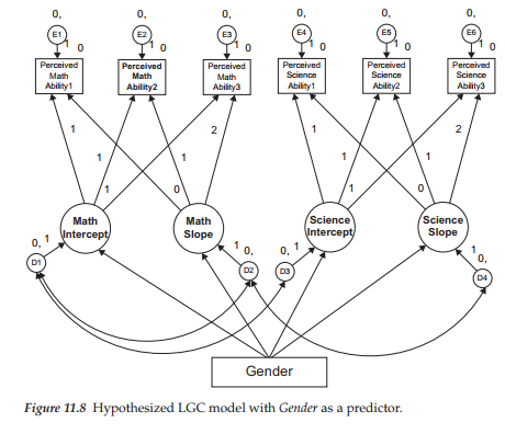 As noted earlier, provided with evidence of interindividual differences, we can then ask whether, and to what extent, one or more predictors might explain this heterogeneity. For our purposes here, we ask whether statistically significant heterogeneity in the individual growth trajectories (i.e., intercept and slope) of perceived ability in math and science can be explained by gender as a time-invariant predictor of change. As such, two questions that we might ask are: “Do self-perceptions of ability in math and science differ for adolescent boys and girls at Time 1 (Grade 8)?” and “Does the rate at which self-perceived ability in math and science change over time differ for adolescent boys and girls?” To answer these questions, the predictor variable “gender” must be incorporated into the Level 2 (or structural) part of the model. This predictor model represents an extension of our final best-fitting multiple domain model (Model 3) and is shown schematically in Figure 11.8.