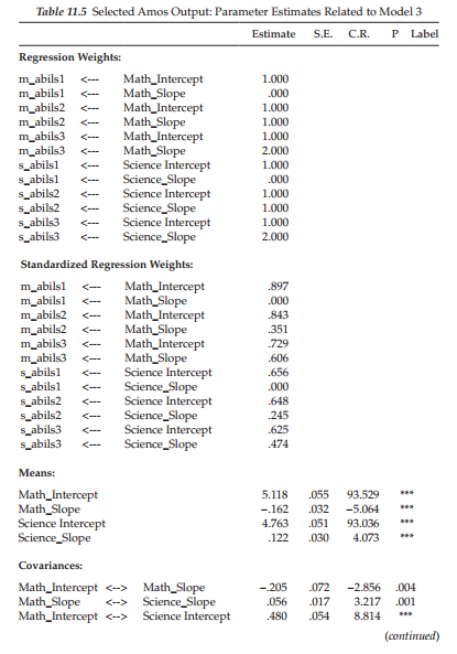 In reviewing these modification indices, we see that not including a covariance between the Math Ability and Science Ability Intercept factors is accounting for the bulk of the misspecification. Given the fairly substantial modification indices associated with the remaining three factor covariances, together with Willet and Sayer’s (1996) caveat that, in multiple-domain LGC models, covariation among the growth parameters across domains should be considered, I respecified a second model (Model 2) in which all four factor covariances were specified. These results, as they relate to the parameter estimates, are reported in Table 11.3.