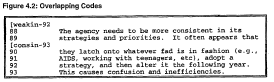 In either manual or computer coding, two codes can overlap: the recording unit for one variable overlaps the recording unit for another variable. Figure 4.2 excerpts an interview in which one objective was to find out what local officials thought about their central agency’s actions. The figure shows two coded variables: “weaknesses in the agency’s strategies” and “consequences of agency actions.” Weaknesses in the agency’s strategies had three categories: inconsistency (coded here as “in”), micromanaging, and other. Consequences of agency actions also had three categories: inefficiency (coded here as “in”), vulnerability to fraud, and other. The code “[weakin-92” indicates that the passage between lines 88 and 92 identifies inconsistency as a weakness of the central agency. The code “[consin-93” between lines 89 and 93, and therefore overlapping the first code, indicates that a consequence of agency action—in this case, inconsistency—is inefficiency.