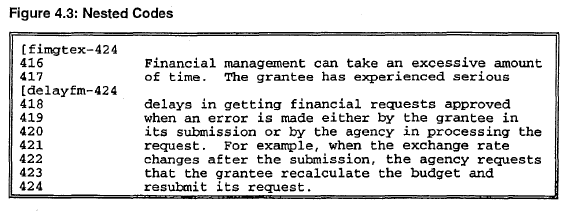 A code is nested within another when the recording unit for one variable completely envelopes the recording unit for another variable. Figure 4.3 shows a coded portion of an interview for two variables. One is “view about time spent on financial management” with three categories: excessive, about right, and insufficient. The other is “causes for project delays” with four categories: financial management problems, insufficient staff, supply shortages, and other. Code “[fimgtex-424” indicates that a passage between fines 416 and 424 expresses the view that time spent on financial management is excessive. Code “[delayfm-424” indicates that a passage between fines .417 and 424 attributes project delays to financial management problems. The second passage is nested within the first; as may be seen from the figure, nesting is a special case of overlapping.