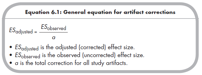 Before turning to these corrections, however, let us consider the general formula for all artifact corrections. The corrected effect size (e.g., r, g, o), which is the estimated effect size if there were no study artifacts, is a function of the effect size observed in the study divided by the total artifact correc- tion1:
