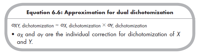 In other words, the artifact adjustment for two variables is approximated by the product of each adjustment for the dichotomization of each variable. The feasibility of this approximation depends on the extremity of the dichot- omization split and the corrected correlation (radjusted). Hunter and Schmidt (1990) showed that this approximation is reasonable when (1) one of the vari-ables has a median (P = .50) split and the corrected correlation is less than .70; (2) one of the variables has an approximately even split (.40 < P < .60) and the corrected correlation is less than .50; or (3) neither of the variables has extreme splits (.20 < P < .80) and the corrected correlation is less than .40. If any of these conditions apply, then this approximation is reasonably accurate (less than 10% bias). If the dichotomizations are more extreme or the corrected correlations are very large, then you should use the tetrachoric correlation described by Hunter and Schmidt (1990).