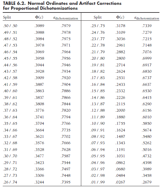The numerator, Φ(c), is the normal ordinate at the point c that divides the standard normal distribution into proportions P and Q. Because this value is unfamiliar to many, I have listed values of Φ(c), as well as the artifact adjustment for dichotomization of one variable (fldichotomizaticm), for various proportional splits in Table 6.2.